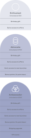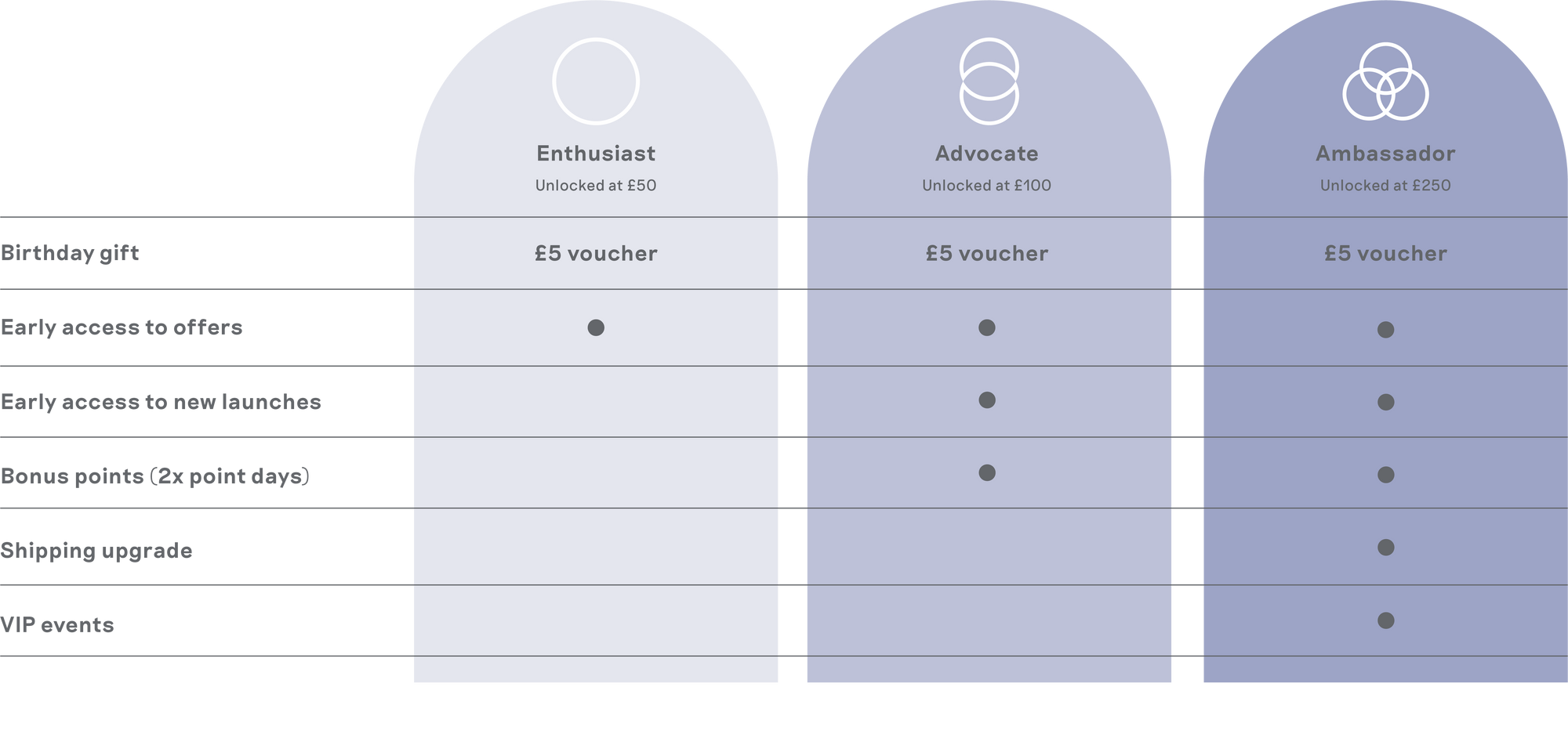 Earn points with every order and gain access to bigger discounts, new launches and early access to sales. You'll unlock additional perks as you move up the tiers!