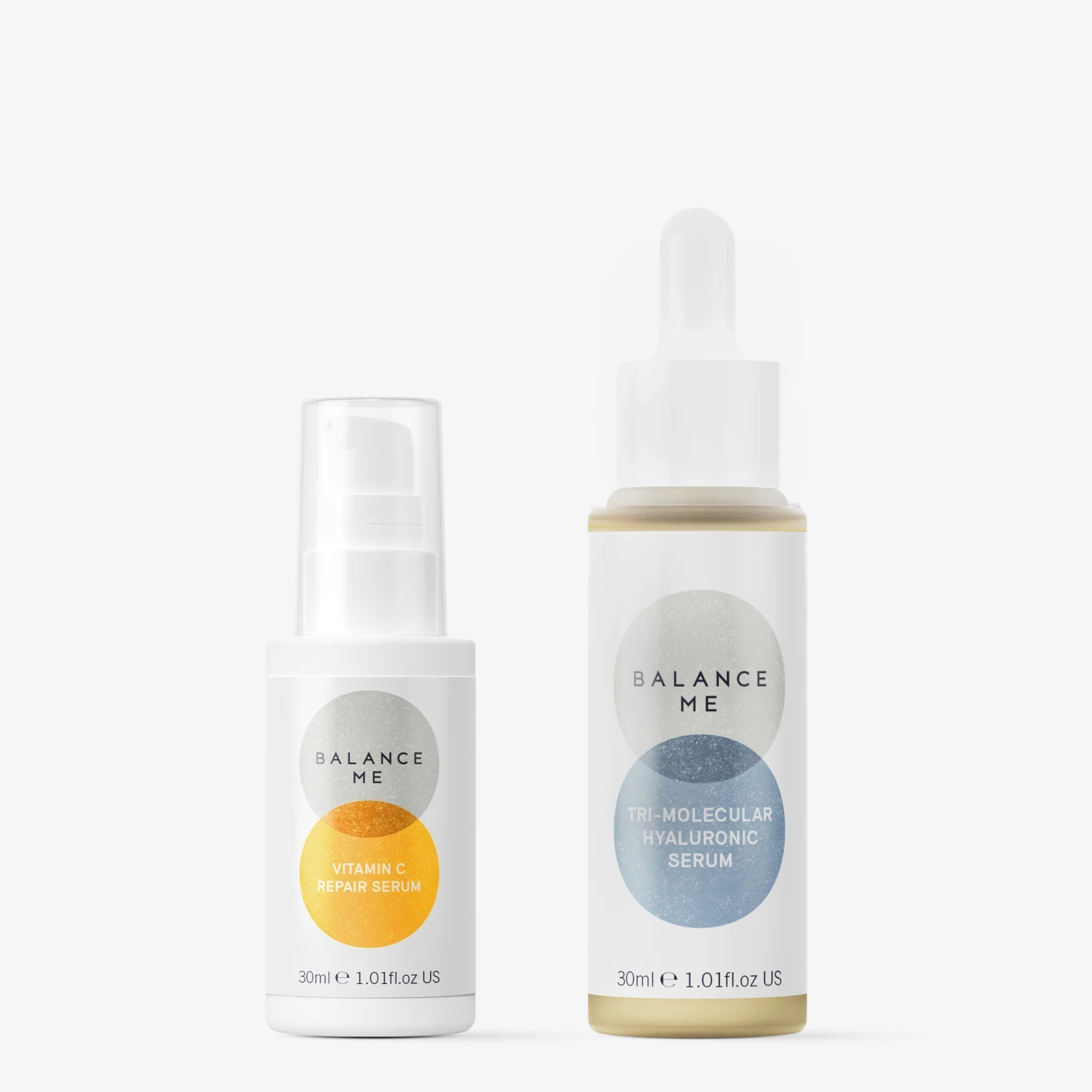 Introducing our hydrating & glow boosting serum duo. Starting with triple-weight hyaluronic acid to instantly plump, hydrate and strengthen the skin barrier. Then apply, our award winning Vitamin C repair serum to boost glow while improving elasticity and refining lines.